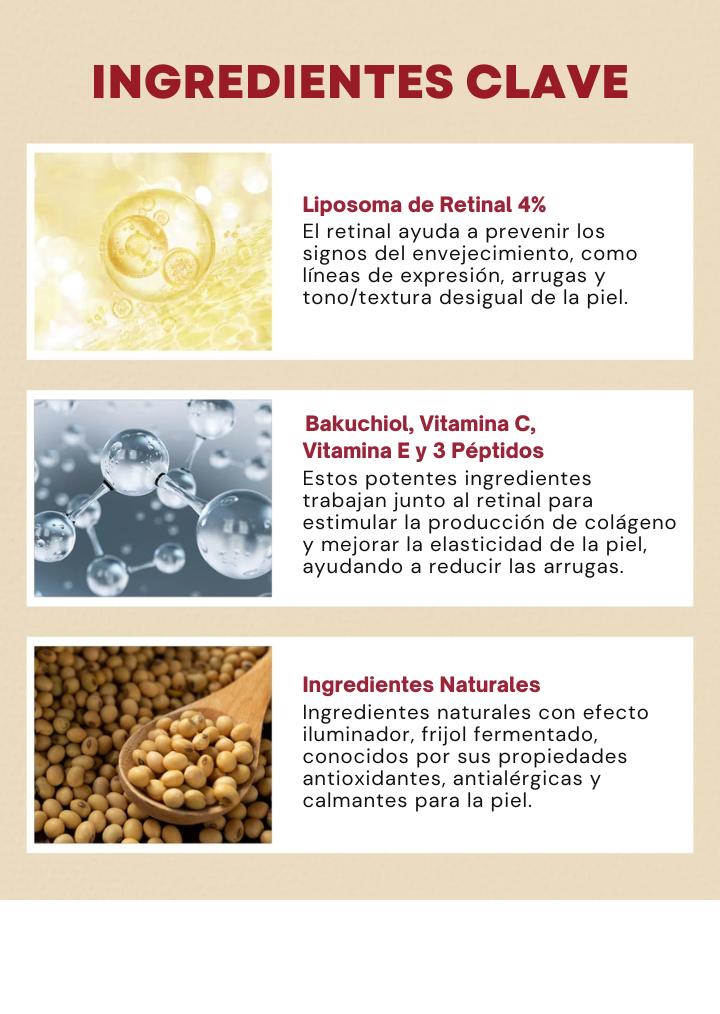 Agua, Glicerina, Dipropilenglicol, Triglicérido Caprílico/Cáprico, 1,2-Hexanodiol, Dicaprilato/Dicaprato de Butilenglicol, Niacinamida, Tetraetilhexanoato de Pentaeritritilo, Alcohol Cetearílico, Butilenglicol, Olivato de Cetearilo, Olivato de Sorbitano, Lecitina Hidrogenada, Aceite de Semilla de Macadamia Ternifolia, Carbómero, Trometamina, Propanodiol, Estearato de Glicerilo, Colesterol, Oleato de Poliglicerilo-10, Etilhexilglicerina, Adenosina, Esteroles de Brassica Campestris (colza), Glutamato de Lauroilo de Fitosterilo/Behenilo/Octildodecilo, Retinal, Sílice, EDTA Disódico, Estearato de Hidróxido de Aluminio/Magnesio, Filtrado de Fermentación de Raíz de Panax Ginseng/Lactobacillus, Fermento de Arroz/Lactobacillus, Extracto Fermentado de Soya/Lactobacillus, Filtrado de Fermento de Semilla de Coix Lacryma-Jobi Ma-yuen/Saccharomyces, Filtrado de Fermento de Extracto de Papa/Saccharomyces, Tocoferol, Fosfato de Cetilo de Potasio, Tetra-di-t-butil Hidroxihidrocinamato de Pentaeritritilo, Hialuronato de Sodio, Extracto de Raíz de Arctium Lappa (bardana), Extracto de Raíz de Cnidium Officinale, Extracto de Raíz de Dioscorea Japonica, Extracto de Raíz de Paeonia Suffruticosa, Extracto de Raíz de Rehmannia Chinensis, Ácido 3-O-Etil Ascórbico, Bakuchiol, sh-Oligopéptido-1, sh-Oligopéptido-2, sh-Polipéptido-1.